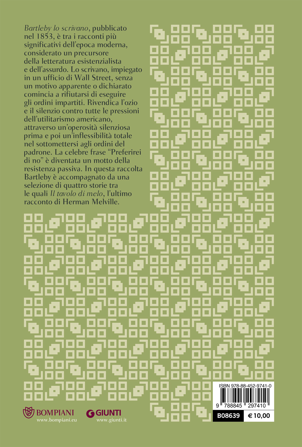 ''Bartleby lo scrivano'', pubblicato nel 1853, è tra i racconti più significativi dell'epoca moderna, considerato un precursore della letteratura esistenzialista e dell'assurdo. Lo scrivano, impiegato in un ufficio di Wall Street, senza un motivo apparente o dichiarato comincia a rifiutarsi di eseguire gli ordini impartiti. Rivendica l'ozio e il silenzio contro tutte le pressioni dell'utilitarismo americano, attraverso un'operosità silenziosa prima e poi un'inflessibilità totale nel sottomettersi agli ordini del padrone. La celebre frase ''Preferirei di no'' è diventata un motto della resistenza passiva. In questa raccolta Bartleby è accompagnato da una selezione di quattro storie tra le quali ''Il tavolo di melo'', l'ultimo racconto di Herman Melville.